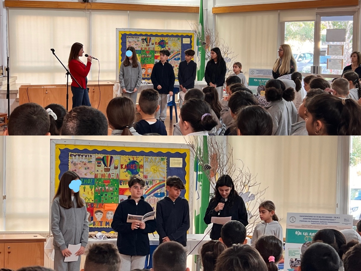 Το δεύτερο θέμα της πρωινής συγκέντρωσης ήταν η ενημέρωση των μαθητών και μαθητριών για τον έπαινο που κέρδισε η σχολική μας μονάδα στον παγκύπριο διαγωνισμό «Εκπαίδευση και ενδυνάμωση μαθητών/μαθητριών για πρόληψη και διαχείριση της σχολικής βίας στο πλαίσιο της πρόληψης της βίας και της νεανικής παραβατικότητας στο σχολεία και της προαγωτής της ενεργού πολιτότητας». Ο συντονιστής του προγράμματος, Βοηθός Διευθυντής, κ. Μάριος Νικολάου και οι δύο προέδροι των τμημάτων της Στ΄τάξης εξήγησαν στα παιδιά πως μέσα από τις δραστηριότητες που οργανώθηκαν στο σχολείο καταφέραμε να βελτιώσουμε το κλίμα του σχολείου μας ενισχύοντας τις κοινωνικές δεξιότητες και την υπεύθυνη στάση και εμπλοκή των παιδιών σε όλες τις διαδικασίες.